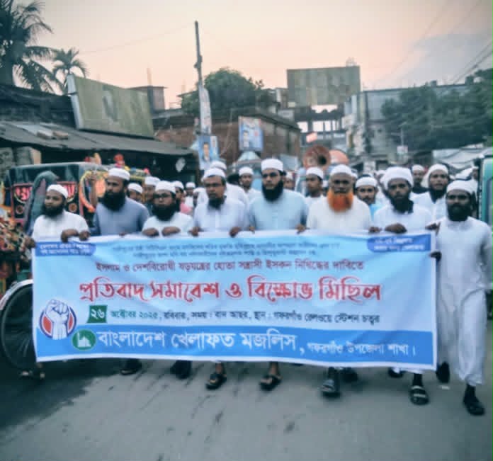 নিজস্ব প্রতিনিধীঃ বাংলাদেশ খেলাফত মজলিস গফরগাঁও শাখার উদ্যোগে আজ ২৬ অক্টোবর রবিবার বাদ আসর গফরগাঁও রেলওয়ে স্টেশন চত্বরে গাজীপুরের টঙ্গী বিটিসিএল জামে মসজিদের খতিব মুফতি মহিবুল্লাহ মাদানীকে অপহরণকারীদের গ্রেফতার, গাজীপুরের আশা মনি সহ ধর্ষনকারীদের দৃষ্টান্তমূলক শাস্তি ও হিন্দুত্ববাদী আগ্রাসন বন্ধ, ইসলাম ও দেশবিরোধী ষড়যন্ত্রের হোতা সন্ত্রাসী ইসকন নিষিদ্ধের দাবিতে প্রতিবাদ সমাবেশ ও বিক্ষোভ মিছিল অনুষ্ঠিত হয়।