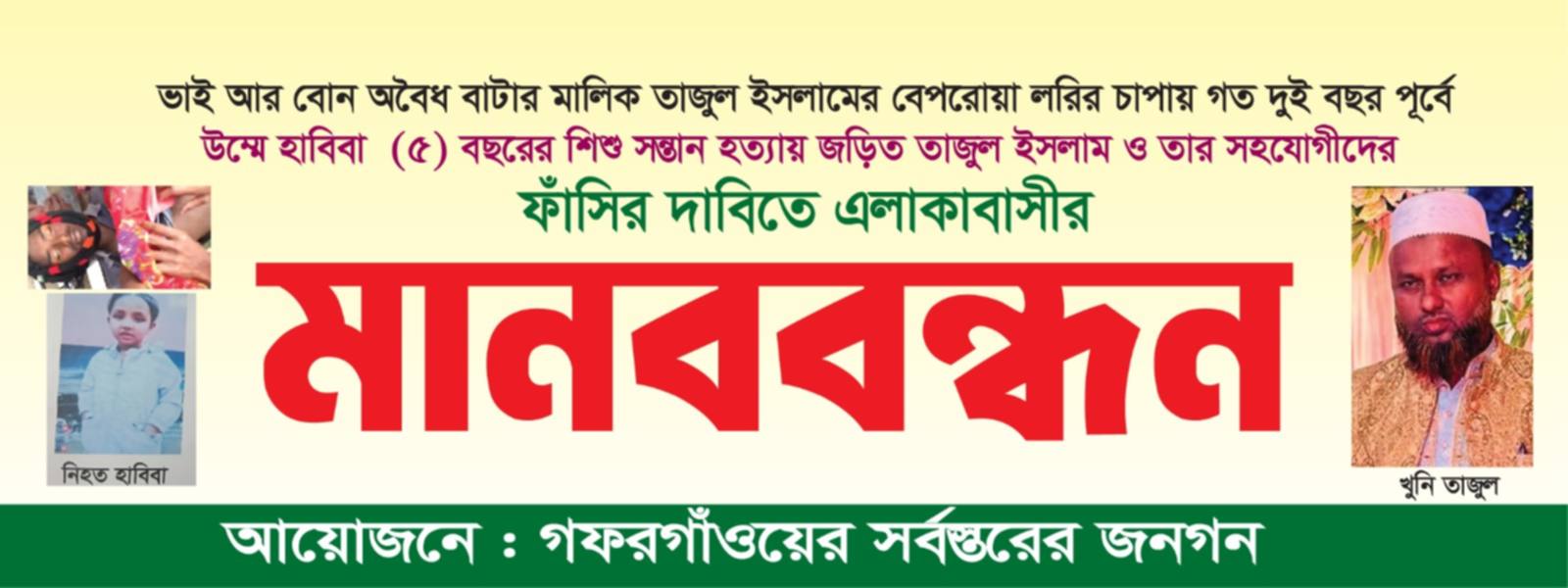 গফরগাঁওয়ে ইটভাটায় লড়ি চাপায় শিশুর মৃত্যু শাস্তির দাবিতে মানববন্ধন