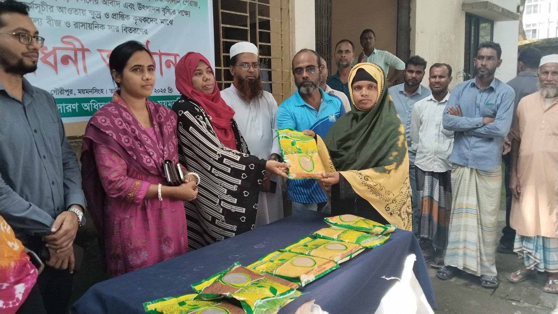 গৌরীপুরে ক্ষুদ্র ও প্রান্তিক কৃষকদের মাঝে বিনামূল্যে বীজ ও সার বিতরণ করছে