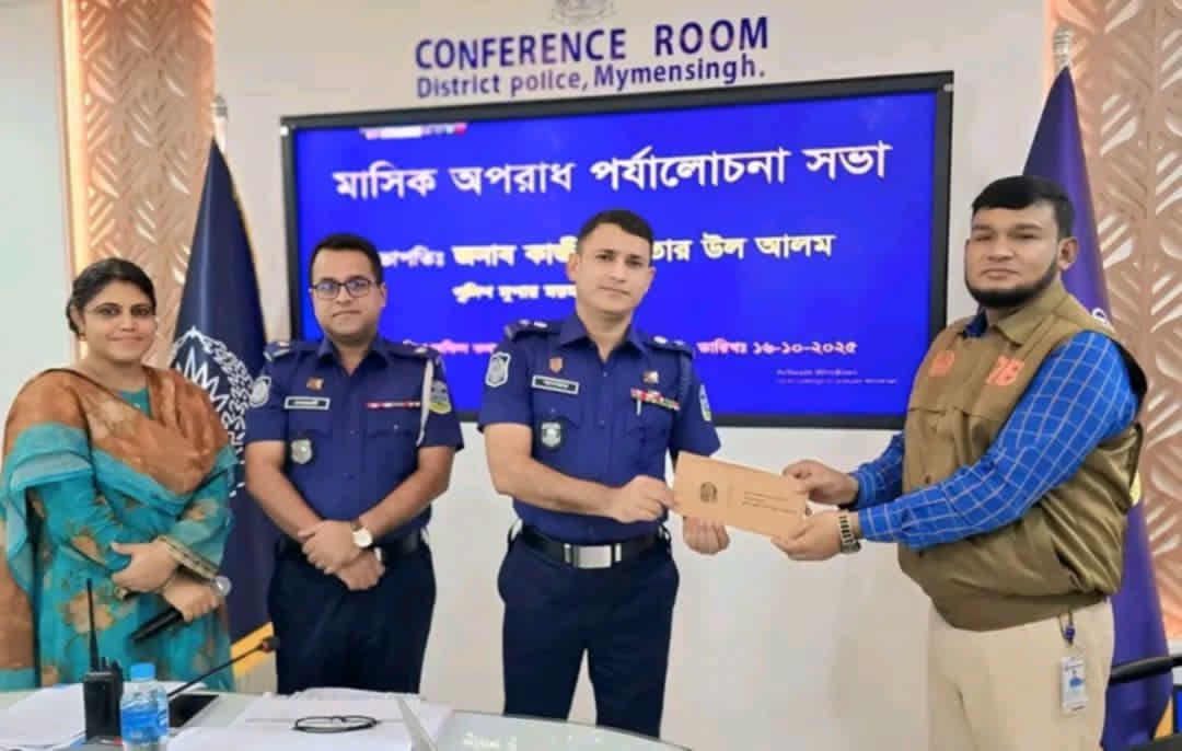 জেলার সার্বিক অপরাধ দমন, তদন্ত কার্যক্রমে সাফল্য ও পেশাদারিত্বের স্বীকৃতি হিসেবে ময়মনসিংহ জেলা গোয়েন্দা শাখা (ডিবি উত্তর)-এর অফিসার ইনচার্জ (ওসি) মোঃ আনোয়ার হোসেনকে বিশেষ পুরস্কার প্রদান করেছেন জেলা পুলিশ সুপার কাজী আখতারুল আলম। সম্প্রতি জেলা পুলিশের মাসিক অপরাধ পর্যালোচনা সভায় এ পুরস্কার তুলে দেন পুলিশ সুপার। সভায় উপস্থিত ছিলেন অতিরিক্ত পুলিশ সুপার (অপরাধ), বিভিন্ন সার্কেলের সহকারী পুলিশ সুপার,থানার ওসি এবং অন্যান্য শাখার কর্মকর্তারা। পুলিশ সূত্রে জানা যায়,ওসি আনোয়ার হোসেনের নেতৃত্বে ডিবি (উত্তর) সম্প্রতি মাদক ও অস্ত্র উদ্ধার, চুরি ও ডাকাতি মামলার রহস্য উদ্ঘাটন, ওয়ারেন্টভুক্ত আসামি গ্রেপ্তারসহ বিভিন্ন ক্ষেত্রে উল্লেখযোগ্য সাফল্য অর্জন করেছে। তাঁর নেতৃত্বে আইনশৃঙ্খলা পরিস্থিতি আরও সুসংগঠিত হয়েছে বলে জানায় জেলা পুলিশ। পুরস্কারপ্রাপ্ত ওসি মোঃ আনোয়ার হোসেন বলেন, “এই স্বীকৃতি আমাকে আরও দায়িত্বশীল ও অনুপ্রাণিত করেছে। পুলিশ সুপার স্যারের নেতৃত্বে আমরা ময়মনসিংহকে একটি নিরাপদ জেলা হিসেবে গড়ে তুলতে বদ্ধপরিকর।” অন্যদিকে পুলিশ সুপার কাজী আখতারুল আলম বলেন, “যারা নিষ্ঠা, সততা ও পেশাদারিত্বের সঙ্গে দায়িত্ব পালন করেন, তাদের স্বীকৃতি দেওয়া আমাদের নৈতিক দায়িত্ব। এই পুরস্কার অন্য কর্মকর্তাদেরও উৎসাহিত করবে।” ময়মনসিংহ জেলা পুলিশের এই সম্মাননা কর্মসূচি ইতিমধ্যে পুলিশের বিভিন্ন স্তরে প্রশংসা অর্জন করেছে। স্থানীয়দের মতে, এমন উদ্যোগ মাঠপর্যায়ে কর্মোদ্যম ও জবাবদিহিতা বাড়াতে গুরুত্বপূর্ণ ভূমিকা রাখবে।