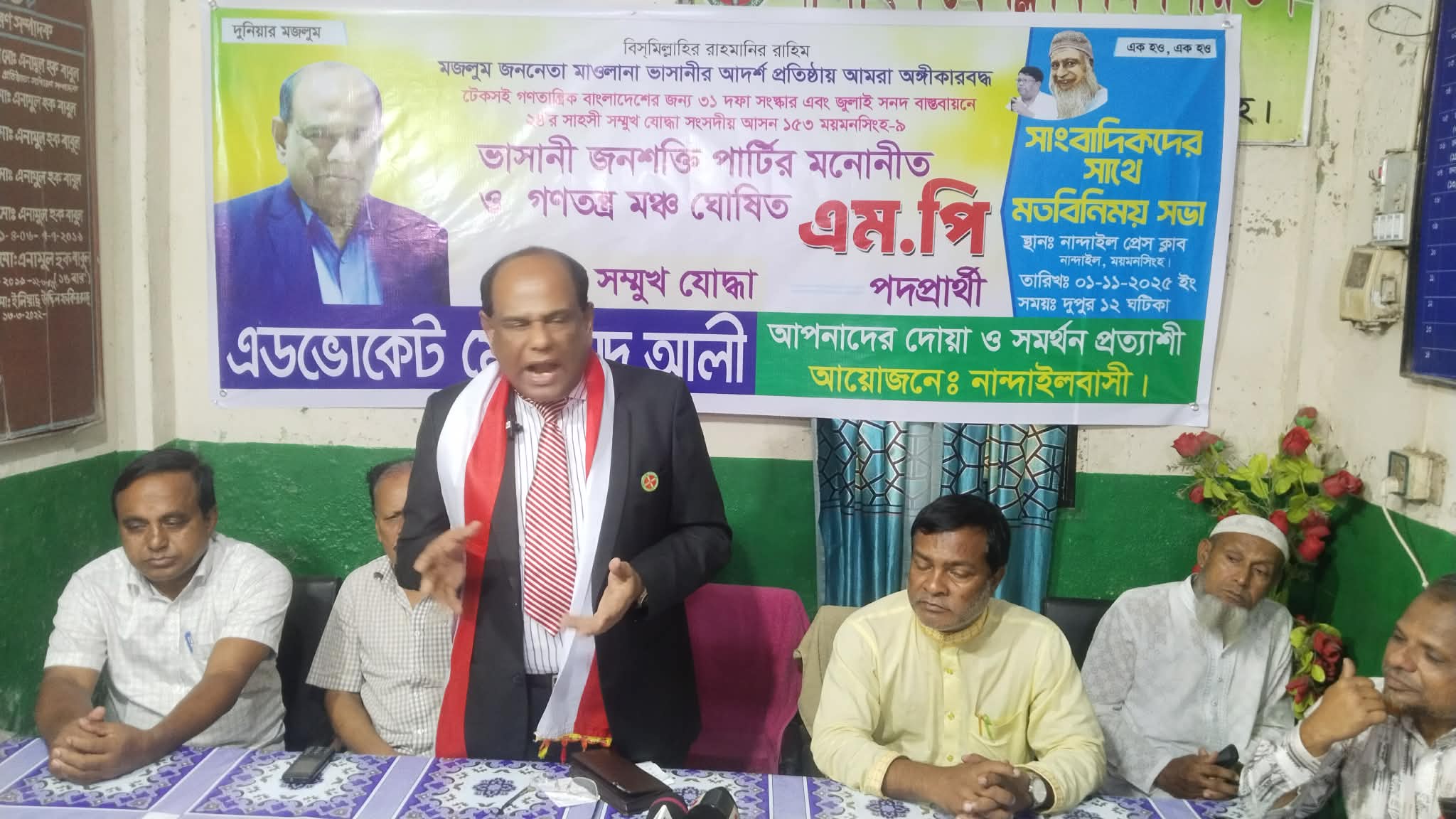 নান্দাইল ময়মনসিংহ বাংলাদেশের টেকসই গণতন্ত্রের লক্ষ্যে ৩১ দফা সংস্কারে ও জুলাই সনদ বাস্তবায়নে নান্দাইলে সাংবাদিকদের সাথে শনিবার ১লা নভেম্বর দুপুরে নান্দাইল প্রেসক্লাব কার্যালয়ে মতবিনিময় করেন ভাসানী জনশক্তি পার্টির কেন্দ্রীয় প্রেসিডিয়াম সদস্য ও গণতন্ত্র ঘোষণা মঞ্চ ঘোষিত এমপি প্রার্থী ১৫৩,ময়মনসিংহ-৯ নান্দাইল আসনে এমপি পদে প্রার্থী এডভোকেট মোহাম্মদ আলী।