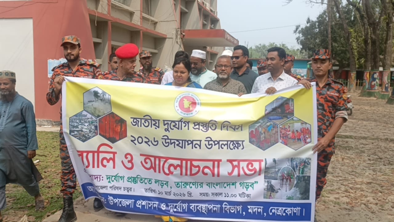 মদন (নেত্রকোনা) প্রতিনিধি : নেত্রকোনার মদনে জাতীয় দুর্যোগ প্রস্তুতি দিবস ২০২৬ উপলক্ষে র্যালি ও আলোচনা সভা অনুষ্ঠিত হয়েছে। মঙ্গলবার (১০ মার্চ) সকালে উপজেলা প্রশাসন ও দুর্যোগ ব্যবস্থাপনা বিভাগের আয়োজনে এ কর্মসূচি পালিত হয়।